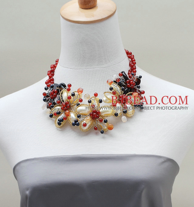 Welcome to buy 2013 Summer New Design Red Series Black Freshwater Pearl and Carnelian and Yellow Shell Flower Necklace from Bjbead.com!!