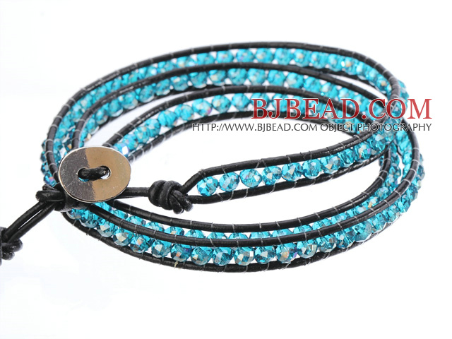 Crystal Jewelry--Crystal Bracelet--Amazing Fashion Multi Strands Blue Crystal Beads Black Leather Woven Wrap Bangle Bracelet With Metal Clasp