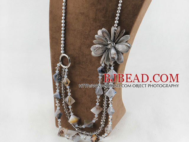 Gemstone Jewelry--Gemstone Necklace--Big Style Pearl Crystal and Gray Shell Flower Party Necklace